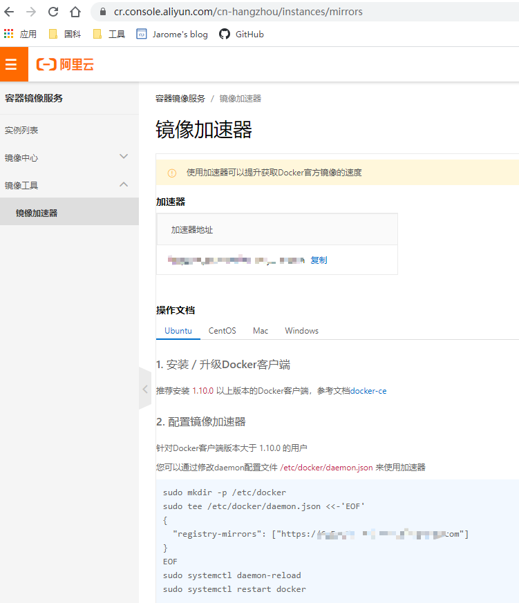 首先从阿里云的容器镜像服务->镜像工具->镜像加速器中获取加速器地址
