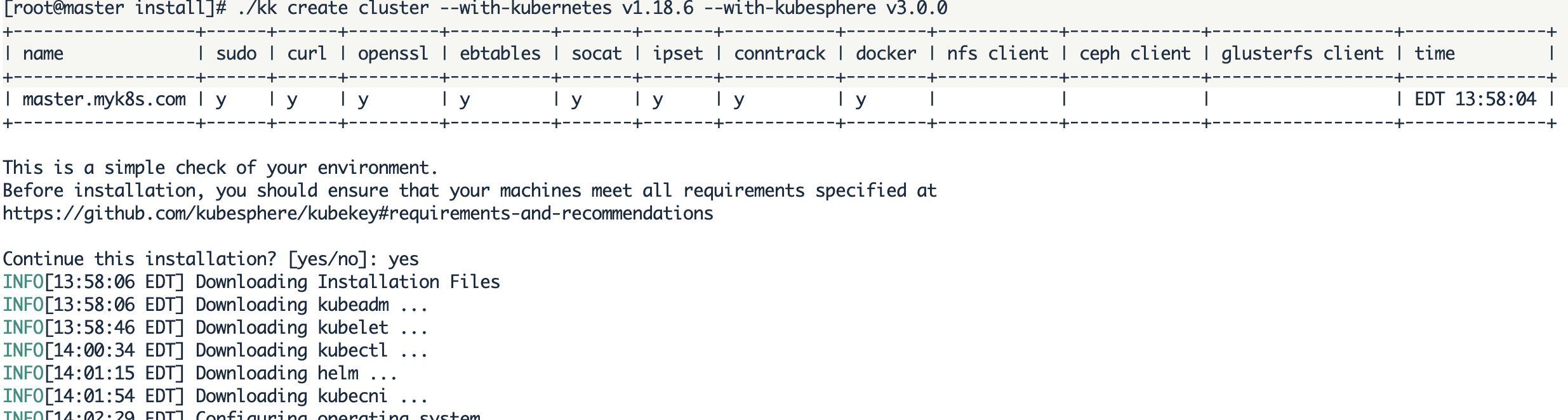 1 | ./kk create cluster --with-kubernetes v1.17.9 --with-kubesphere v3.0.0 |