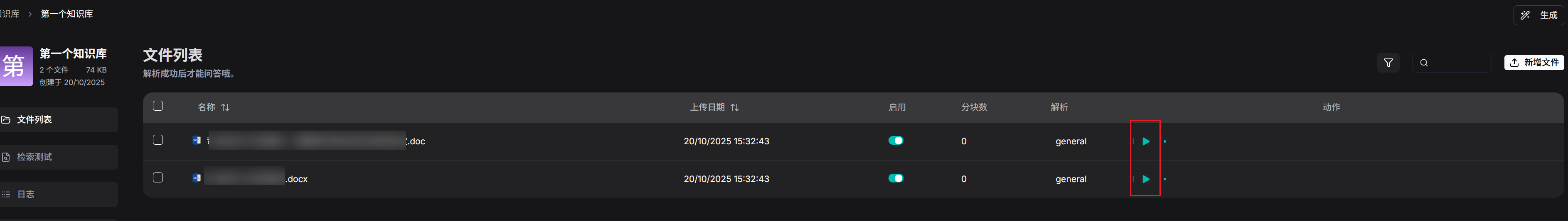 知识库创建完成后新增文件,然后点击开始按钮开始解析文件