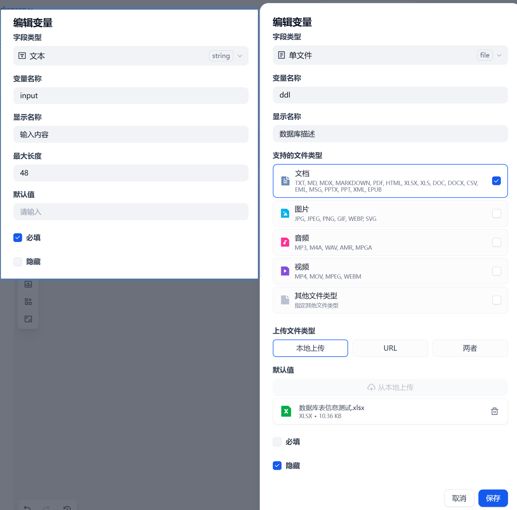 这里我为了避免运行的时候上传文件,所以对ddl设置了默认值,并且将其隐藏了。实际应用中可以在执行工作流的时候传递。
