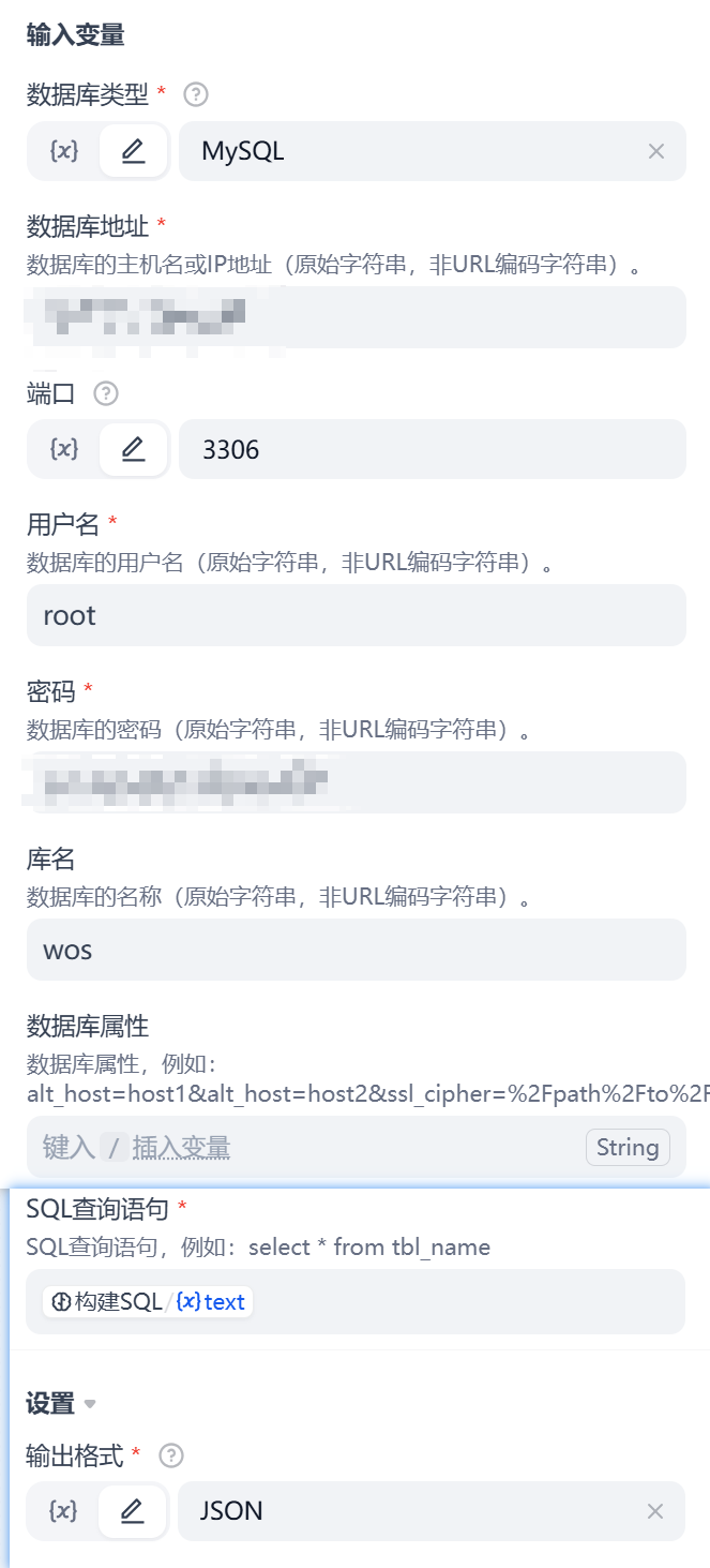 在该节点需要录入你的数据库信息,该插件目前支持的数据库有: MySQL,Oracle,SQLServer,PostgreSQL