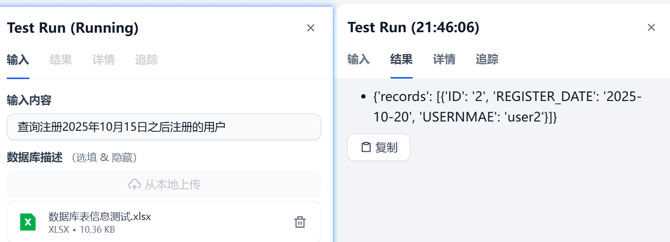输入“查询注册2025年10月15日之后注册的用户”进行测试,返回结果显示查询到了ID为2的用户记录,查询结果正确。
